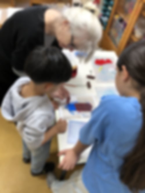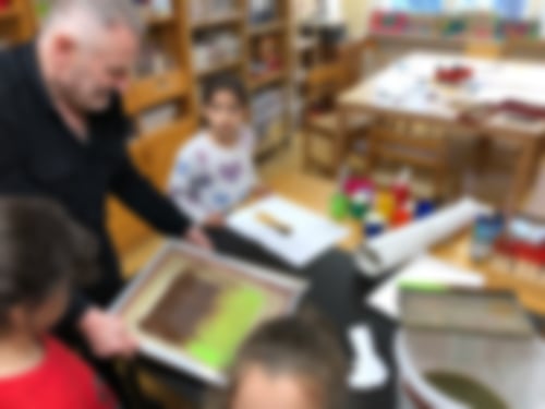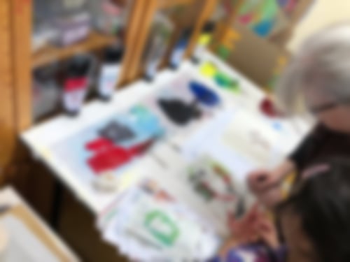 Heute haben wir eine spannende Technik erprobt: den Siebdruck. Dabei wird erst eine Vorlage gezeichnet und ausgeschnitten und dann unter einem feinen Netz oder Sieb befestigt. Das Blatt, auf dem das Bild entstehen soll, wird daruntergelegt. Dann kommt dicke Druckfarbe auf das Sieb und wird mit einem Brettchen darüber gezogen und dabei auch durchgedrückt. An den freien Stellen entsteht eine Farbfläche. Wir haben dabei sogar mehrere Farben nacheinander auf ein Blatt gedruckt!