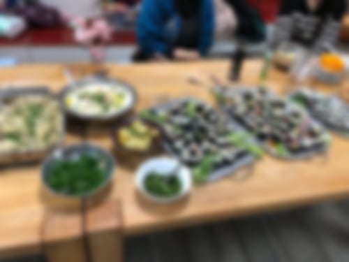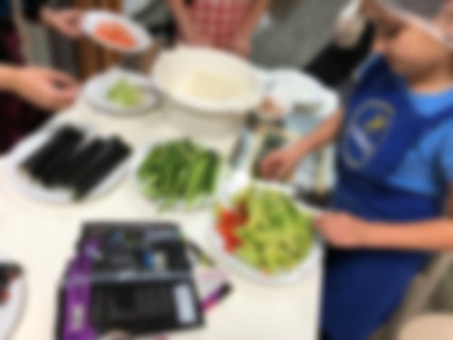 Wir hatten ja angekündigt, dass wir zum Jahresabschluss des Kochprojekts besonders lecker und vielfältig kochen wollten, und genau das haben wir auch gemacht! Es gab nicht nur Ofenkartoffeln und zwei Fleischgerichte (Hühnchen und Lammköfte in Gemüsesauce) mit Brot, Yoghurtdip, Reis und vielen Kräutern, die große Salatplatte erwähne ich nur der Vollständigkeit halber.... Zum erstenmal haben die Kinder unter Mahruzahs Anleitung zwei ganze Platten Sushi gerollt, vegetarisch und mit Fisch. Die gab es natürlich komplett mit Sojasauce, eingelegtem Ingwer und scharfer Wasabipaste. Einige mutige Kids haben das Wasabi auch mit aller gebotenen Vorsicht probiert - Brot und Yoghurt zum „Löschen“ standen ja auf dem Tisch.