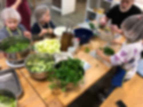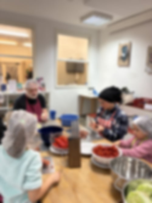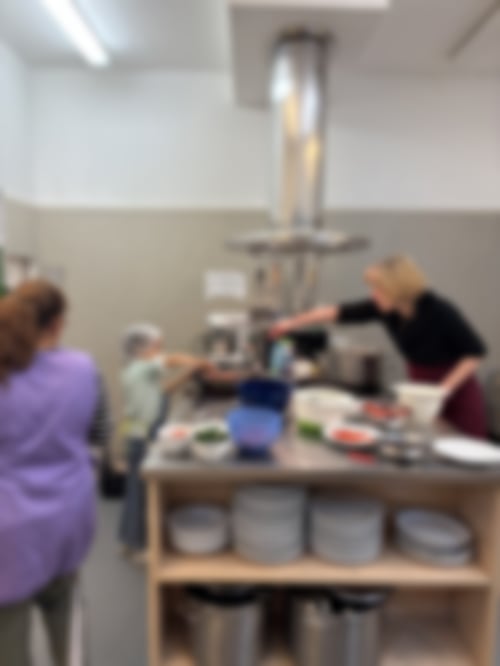 Und dann stand auch schon der köstlich duftende Auflauf auf dem großen Tisch…und dieser Duft lockte so manche*n Esser*in mehrmals zum Nachschlag holen - auch die Gäste aus dem Haus und die Besucher*innen des Treffs. In der anschließenden Abschlussrunde konnte Liane dann sogar ein kleines Geschenk für die Kochgruppe überreichen: Anita aus der Töpferwerkstatt hatte als kleines Dankeschön leckere Kekse für uns gebacken und eine Karte geschrieben, die Alice in der Runde vorlas.